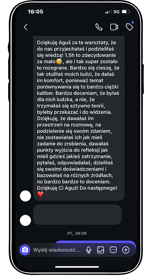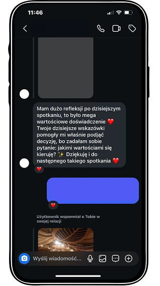Nie po to, żeby Cię oceniać — ale by razem znaleźć to, co w Tobie najmocniejsze, i spokojnie zajrzeć tam, gdzie najbardziej boli. - A ty poznajesz siebie i przez to uczysz się też stawiać granice — innym i sobie.