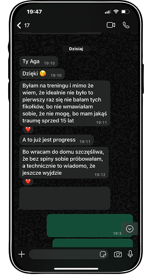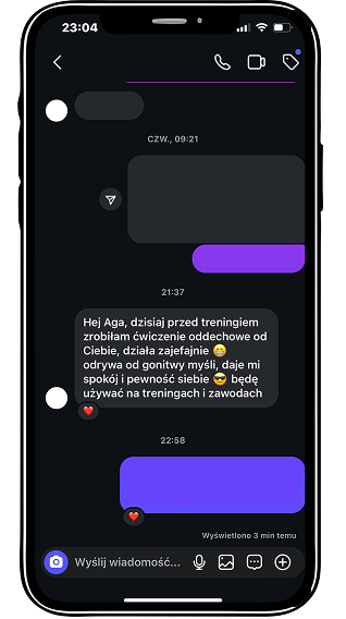 “Po spotkaniach z Agą czuję, że mam moc i zasoby, by działać. Dostałam narzędzia, by wyjść z automatycznych blokujących obaw, które pojawiają się na myśl o zawodach. Czuję się bardziej pewna siebie, lepiej przygotowana i spokojna, że dam sobie radę. Aga cały czas się rozwija i sięga do naukowych źródeł informacji, co jest dla mnie ważne. I totalnie propsuję Agę za wiedzę na tematy jak np. cykl hormonalny kobiet czy ADHD i ich wpływ na treningi! Dzięki czemu widzę, że indywidualnie podchodzi do każdego człowieka i tego, z jakimi wyzwaniami przychodzi.”