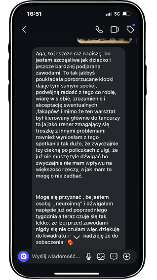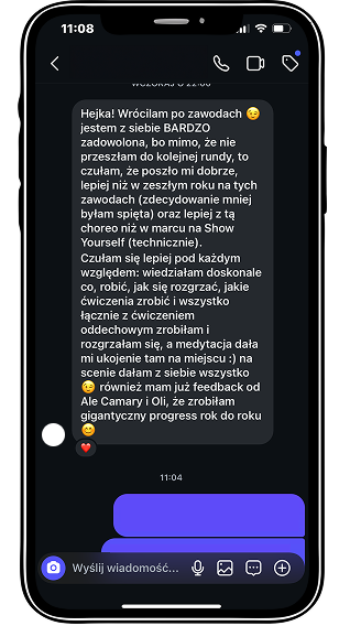 Chcę naprawdę Cię poznać, zobaczyć, co w Tobie działa, a co Ci przeszkadza — i znaleźć sposób, który będzie działał dla Ciebie, nie dla wszystkich. - Bo to, co zbudujesz ze mną w głowie, zostanie z Tobą na każdą kolejną scenę, zawody i życiowy zakręt.